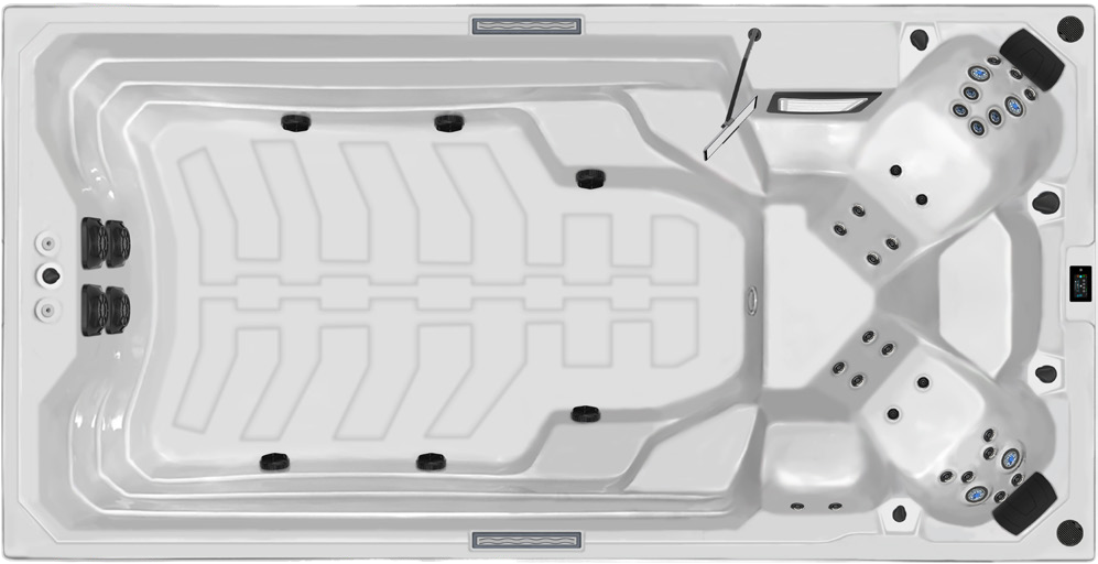 • Двойная гидросистема: 31 массажная форсунка и 2 мощных насоса противотока (2,2 кВт) обеспечивают одновременно нежный массаж и профессиональные условия для плавания