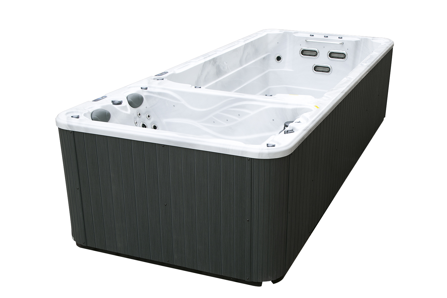 Два гидромассажных насоса по 1,5 кВт в сочетании с 76 форсунками обеспечивают интенсивный массаж и эффективную гидродинамику в спа-зоне. Мощный водяной насос на 2,9 кВт и форсунки противотока нового поколения создают идеальные условия для занятий плаванием и тренировок на воде в основной части бассейна.