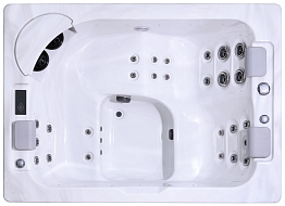 Гидромассажный мини СПА-бассейн Joy Spa JY 8020 имеет более скромные габариты, чем стандартные гидромассажные бассейны, но благодаря этому может вписываться в помещение с небольшой площадью. Каждое место в бассейне устроено так, чтобы пользователи чувствовали себя максимально комфортно. Для сидячих мест предусмотрена совмещенная зона для ног. Для полноценного массажа спины и ягодиц установлены воздушные и водяные форсунки. Также предусмотрены удобные мягкие накладки в области шеи, чтобы каждый пользователь мог полностью расслабиться и наслаждаться процедурами. Наличие лежака в чаше бассейна обеспечивает полноценный гидромассаж всего тела. Здесь форсунки установлены не только в области спины, они обеспечивают массаж ног, включая икры и стопы.